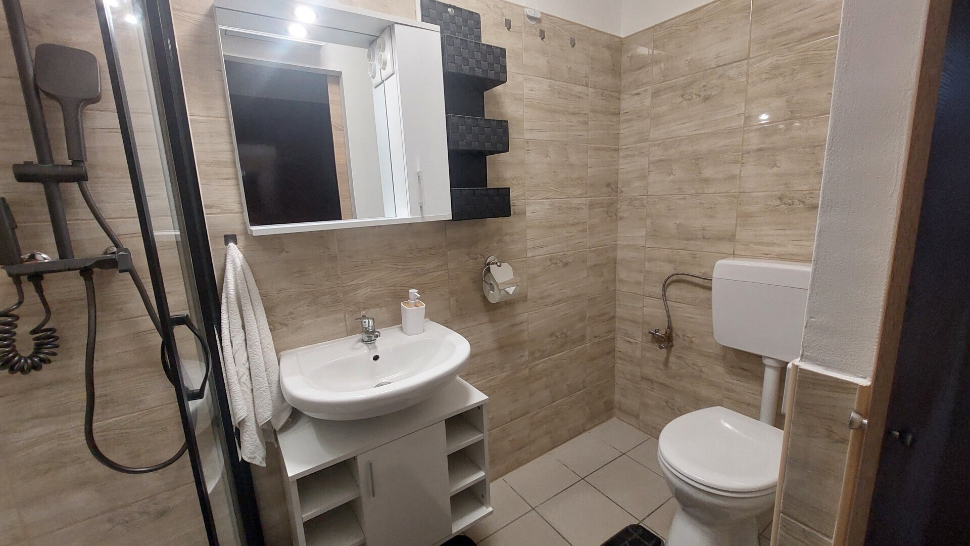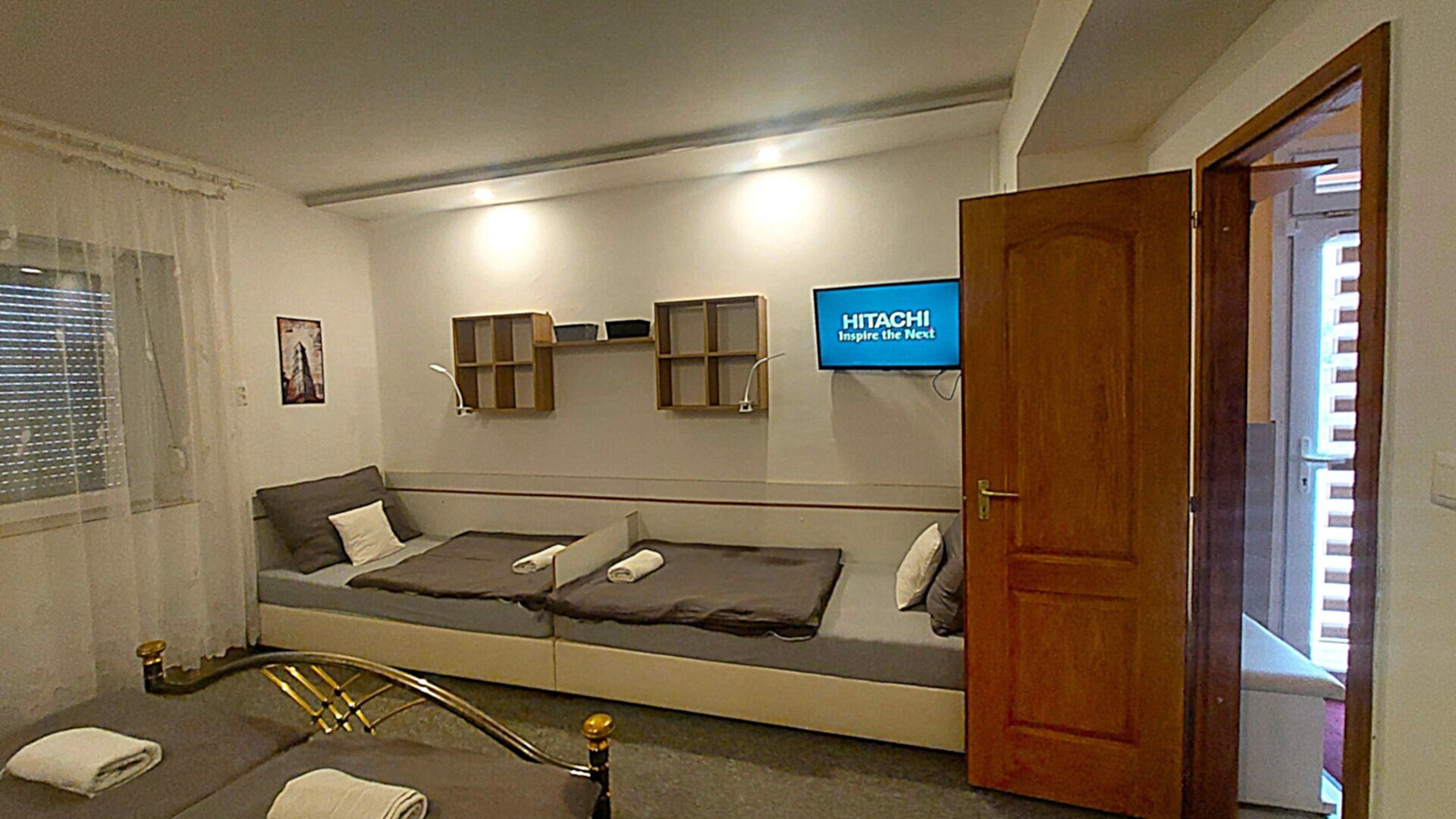 The ground-floor 6+2 person apartment includes a bedroom, living room, fully equipped kitchen, and bathroom. The bedroom has one double bed and two single beds, and the living room has a pull-out sofa for two people. The unit opens to the street, with parking spaces in front, but no yard. The room has a flat-screen TV, WiFi, and a fully equipped kitchen (coffee maker, stove, kettle, cookware, etc.). Nearby there is a grocery store (Coop abc), Rossmann, Pepco, bakery, ice cream shop, pizzeria, restaurant etc.