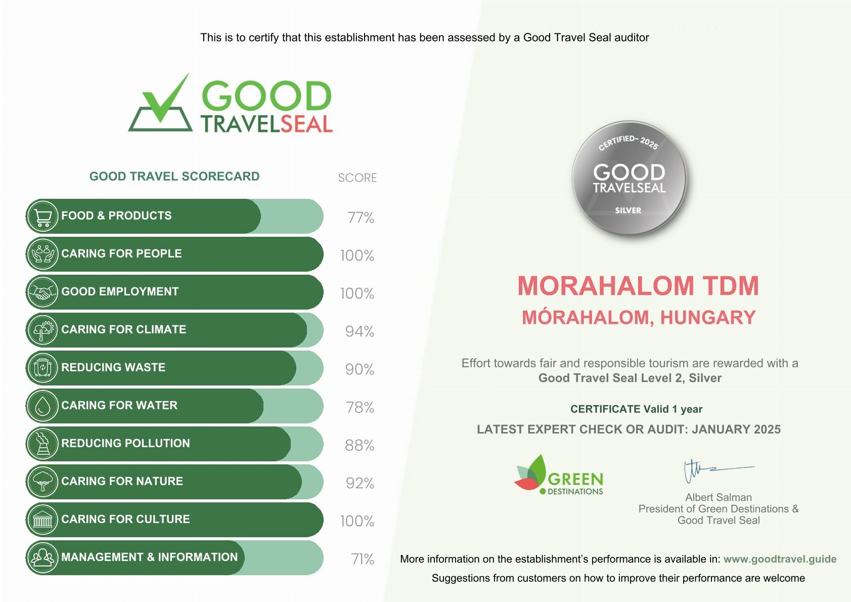 In the system consisting of three levels and five grades, the Silver certification means that the Mórahalom Tourist Office not only meets the basic sustainability criteria but exceeds them.
