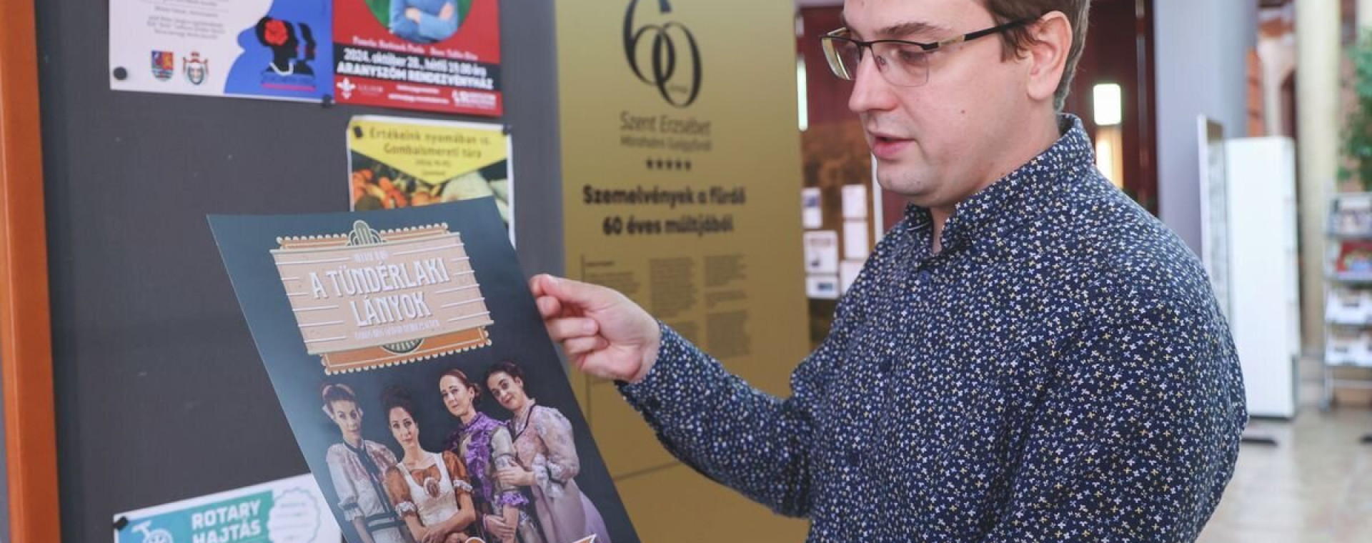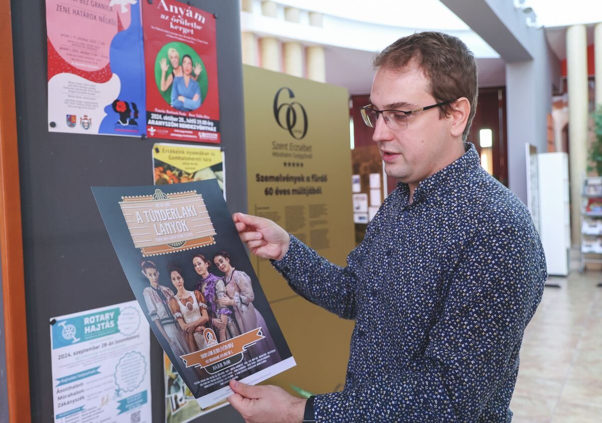 Molnár András, a mórahalmi Aranyszöm Rendezvényház ügyvezető igazgatója a következő előadás plakátját mutatja. Fotó: Karnok Csaba