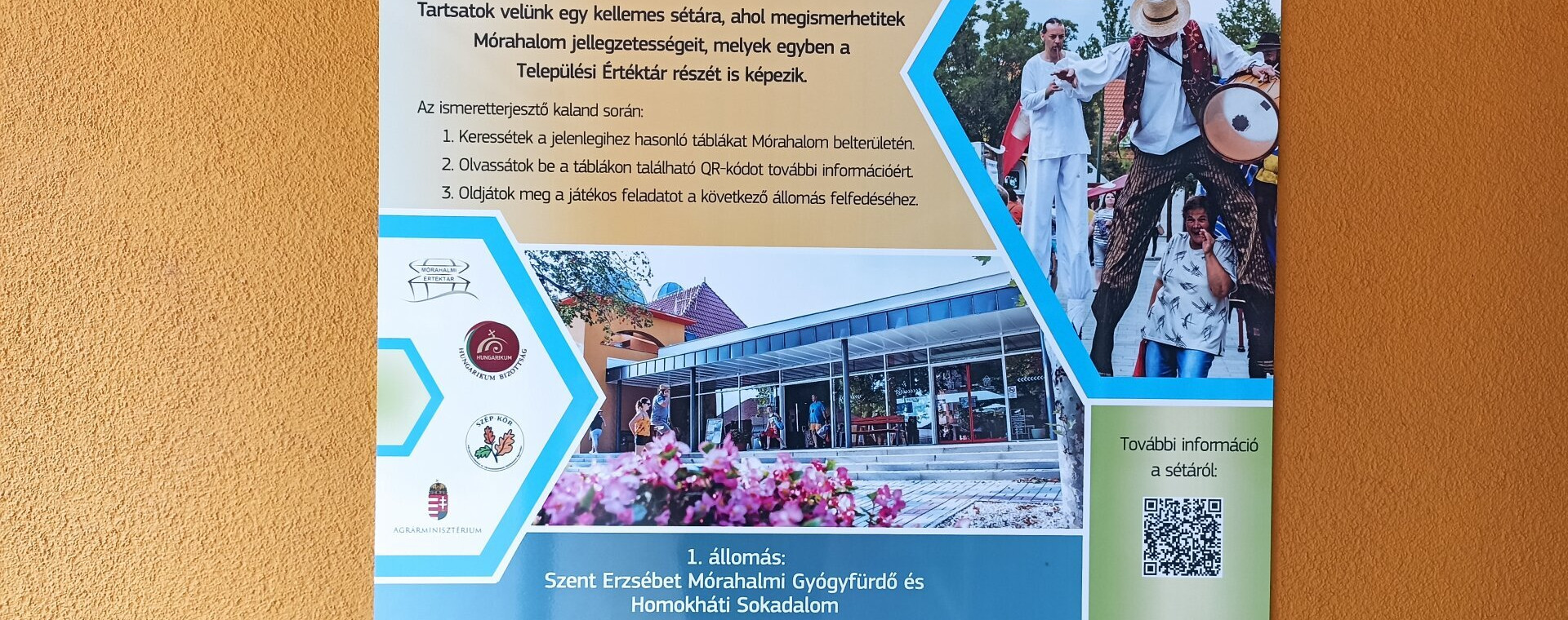 A helyi értékekre építve gyalogosan bejárható sétaútvonal került kialakításra Mórahalom belterületén. A 6 állomás mindegyikén található egy – egységes kinézetű – tábla. Itt a QR-kódot beolvasva bővebb információhoz jutnak az érintett helyi értékről, illetve JÁTÉKOS FELADATOK is színesítik az állomásokat és így a sétát.