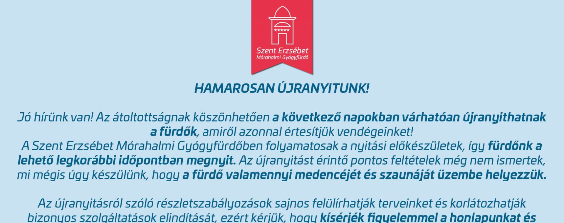 HAMAROSAN ÚJRANYITÁS! Kövessék a fürdő Facebook oldalát (https://www.facebook.com/furdomorahalom) és értesüljenek első kézből az újranyitás időpontjáról, valamint az elérhető szolgáltatásokról!