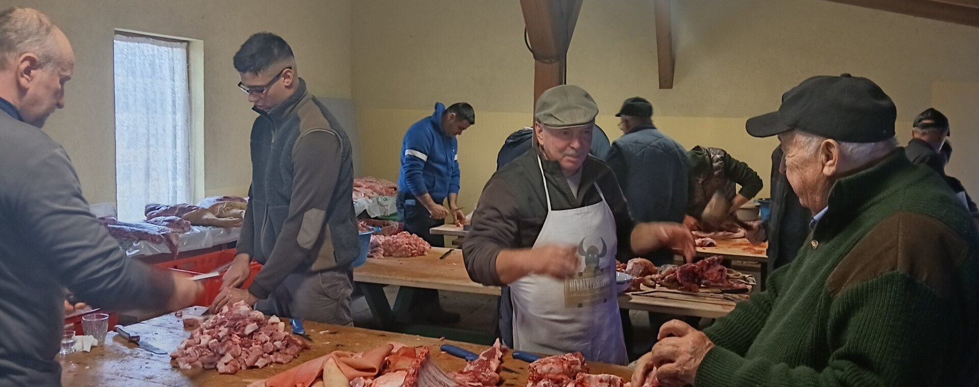 A tegnapi és a mai disznóvágás eredményét kóstolhatják majd meg a település lakói az Aranyszöm Rendezvényház belső udvarán felállított sátorban Nógrádi Zoltán polgármester és Kopasz István plébános beszédét, valamint a műsorszámokat követően. Addig azonban mutatunk néhány fotót arról, ahogy a Gazdakör tagjai jó hangulatban dolgozzák fel a húst, hogy azután örömmel tehessék a nagy közös ünnepi asztalra.