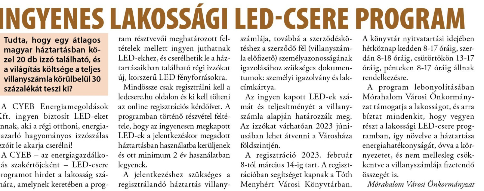 A CYEB - az energiagazdálkodás szakértőjeként - LED-csere programot hirdet a lakosság számára, amelynek keretében a program résztvevői meghatározott feltételek mellett ingyen juthatnak LED-ekhez, és cserélhetik le a háztartásaikban található régi izzókat új, korszerű LED fényforrásokra.