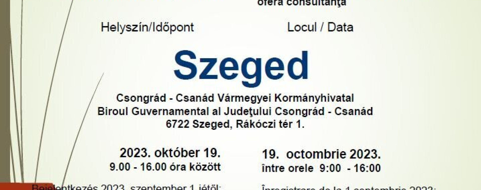 2023. október 19-én Magyar-román Nyugdíjtanácsadó Nap megtartására kerül sor a Kormányhivatal Rákóczi tér 1. szám alatti épületében. Az érdeklődő ügyfelek számára a nemzetközi ügyintézéssel foglalkozó munkatársak személyre szóló tájékoztatást adnak a magyar és román nyugdíjjogosultság feltételeiről, folyamatban levő ügyeikről, az ügyintézési teendőkről.