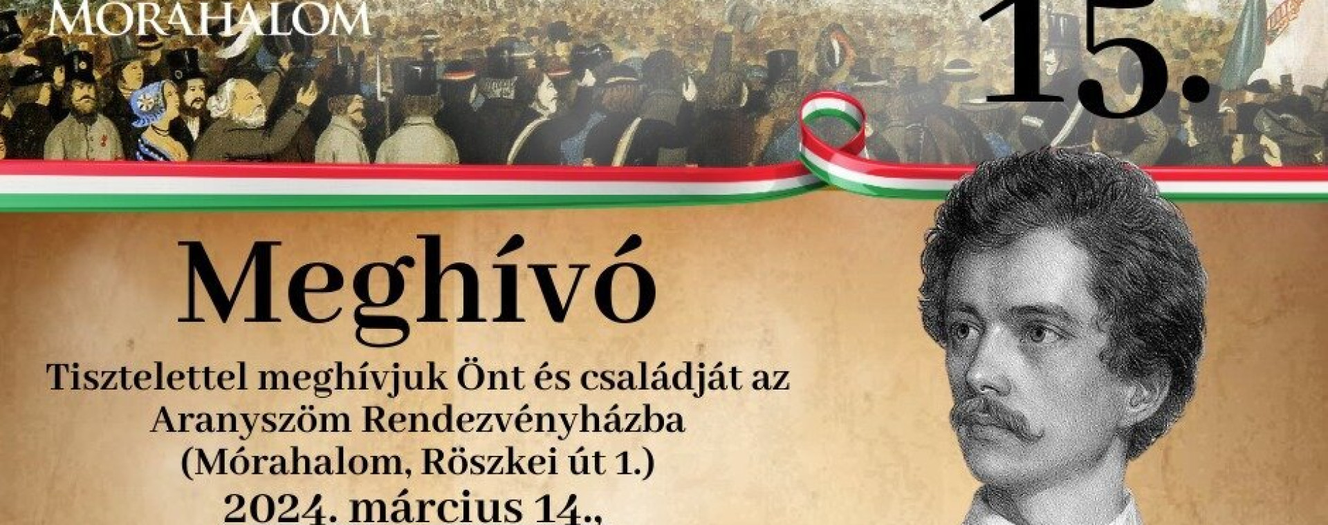Tisztelettel meghívjuk Önt és családját az Aranyszöm Rendezvényházba 2024. március 14., csütörtök 17 óráraaz 1848/49-es Forradalom és Szabadságharc ünnepi megemlékezésére.