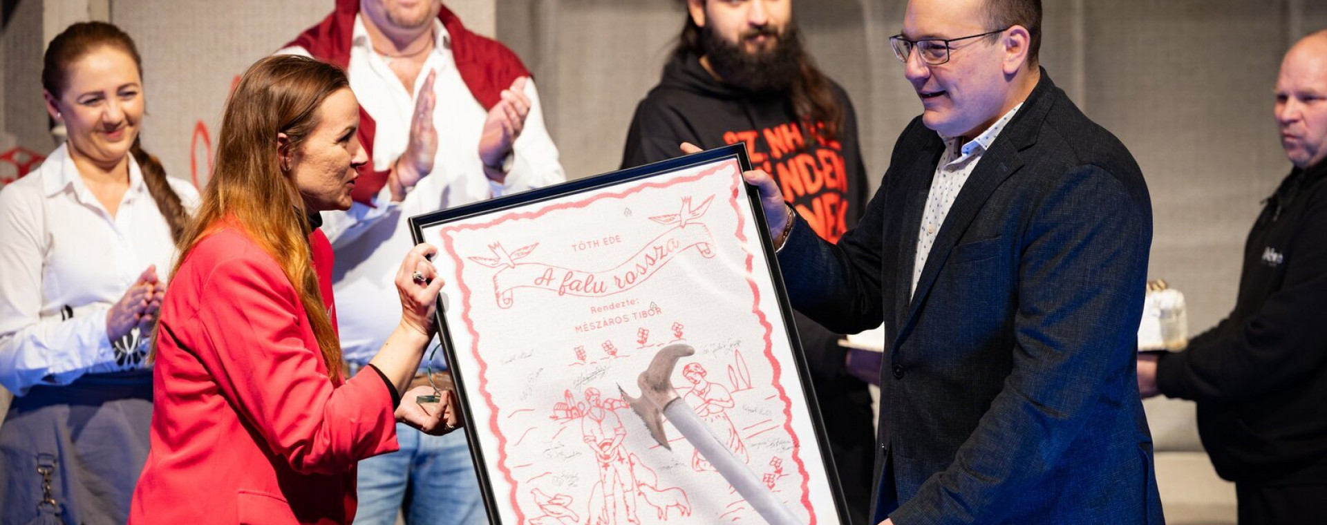 A „Színház mindenkinek!” mottójú kulturális misszió széles körben szólítja meg a magyar színházi élet résztvevőit, és teszi elérhetővé a minőségi kultúrát a kistelepüléseken. A péntek esti jubileumi eseményen megjelent a Déryné Program igazgatója, Kis Domonkos Márk, aki köszöntötte a társulatot, valamint emlékplakettet adott át a Rendezvényház munkatársának a kiváló együttműködés jelképeként.(fotó: Déryné Program)