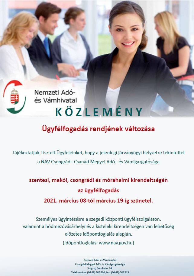 Tájékoztatjuk Önöket, hogy a NAV ügyfélfogadása 2021. március 8-tól március19-ig szünetel a mórahalmi kirendeltségen.