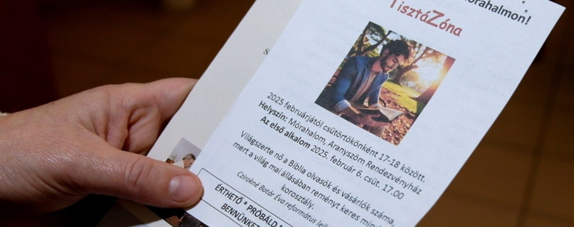 A találkozókon lehetőség nyílik a Biblia tanításain keresztül önmagunk megismerésére, lelki felfedező útra indulni.Az első alkalom február 6. (csütörtök) 17 óra.A program ingyenes, mindenkit szeretettel várnak!(A Móra-Net Televízió stábja interjút készített Czirokné Botár Évával. Figyeljék keddi műsorajánlónkat itt a Facebookon, amelyekből kiderül, mikor kerül adásba a beszélgetés.)