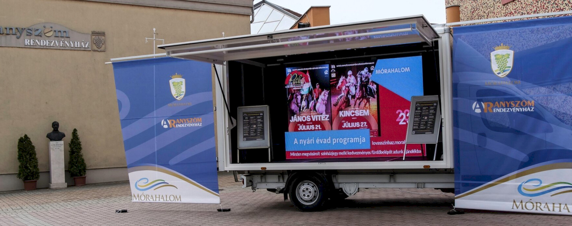 A gyorstelepítésű LED-falas mobil színpad fél óra alatt bárhol felállítható, így kisebb volumenű előadásokra tökéletesen alkalmas.