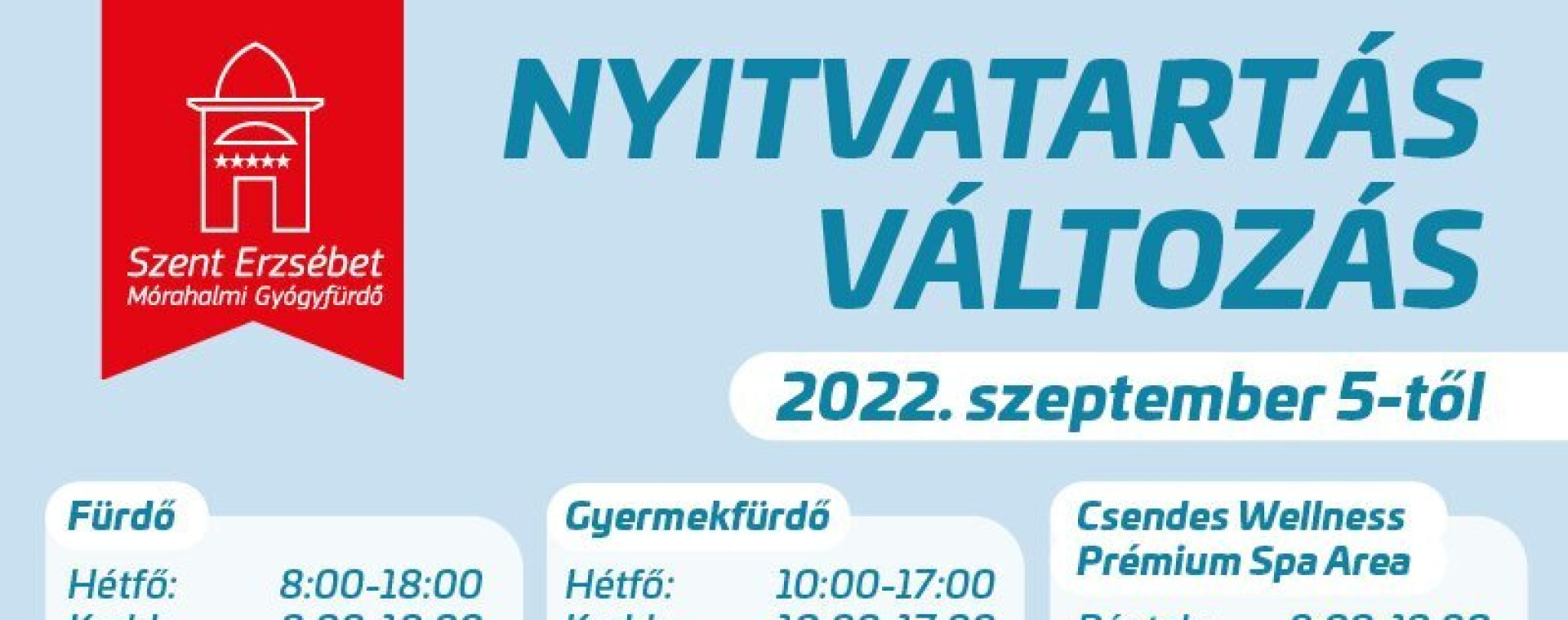Figyelem! Nyitva tartás változás! További részletek: https://erzsebetfurdo.morahalom.hu/hu/furdo-nyitva-tartas