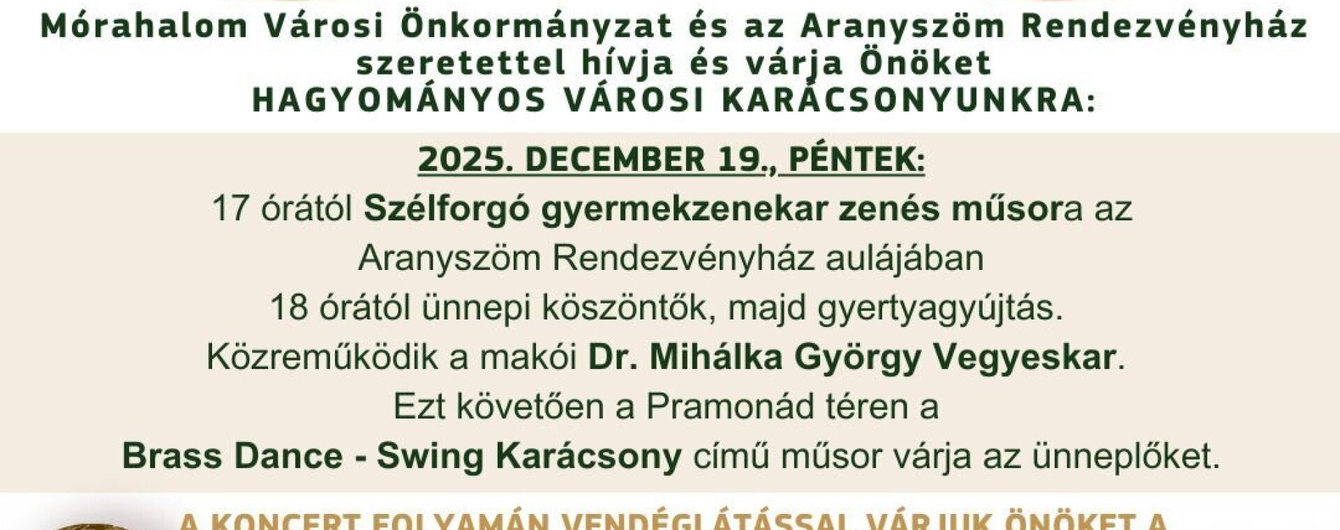 Közeledik Mórahalom legszebb ünnepi eseménye – a Városkarácsony!December 19-én együtt gyújtjuk meg a IV. adventi gyertyát, együtt hallgatjuk meg a karácsonyi dallamokat, és együtt hangolódunk az ünnepre egy igazán közösségi élmény keretében.