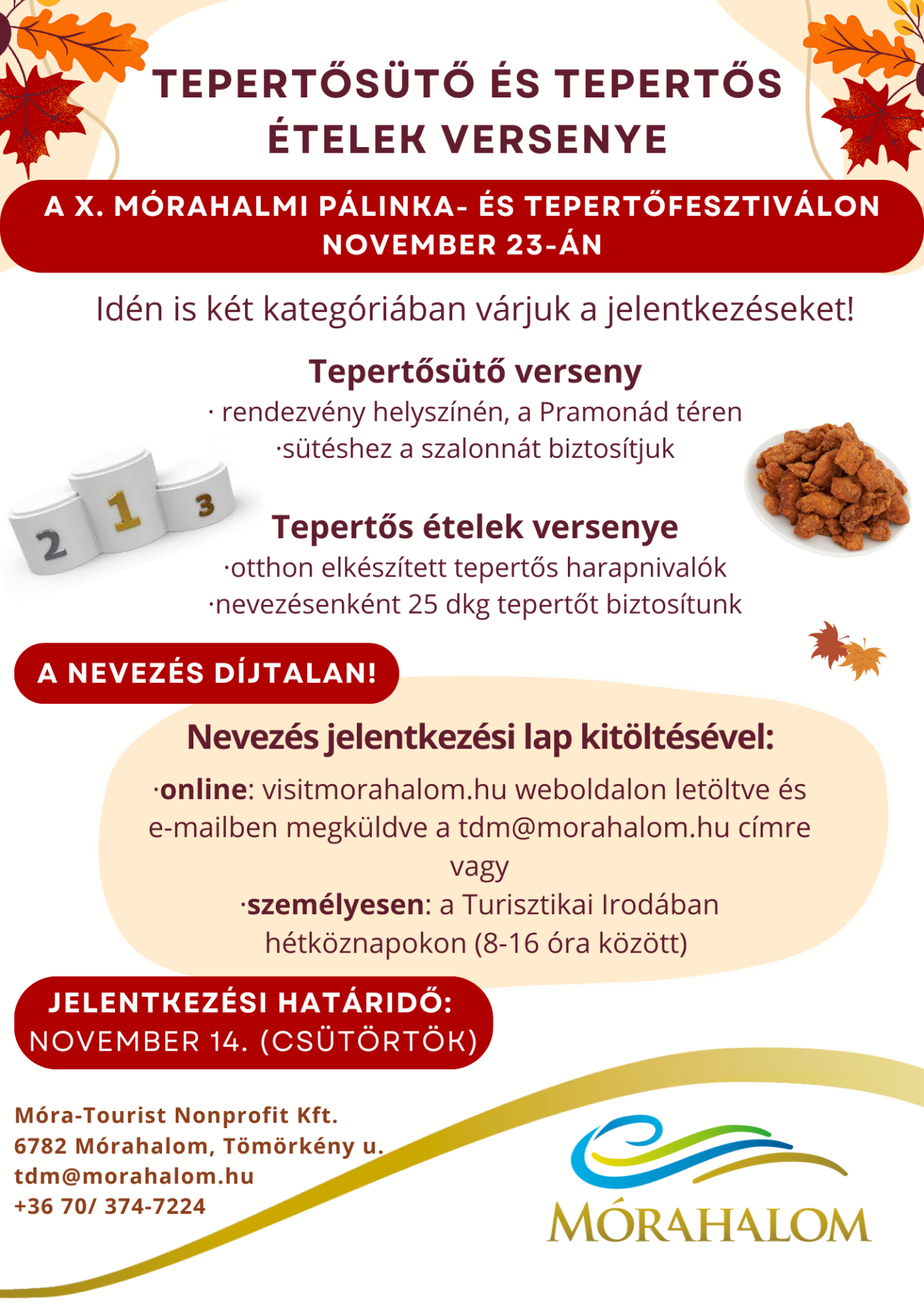 Idén tizedik alkalommal kerül megrendezésre a Mórahalmi Pálinka- és Tepertőfesztivál, melyhez kapcsolódóan elindult a nevezés a tepertős ételek versenyére, és a tepertősütésre.