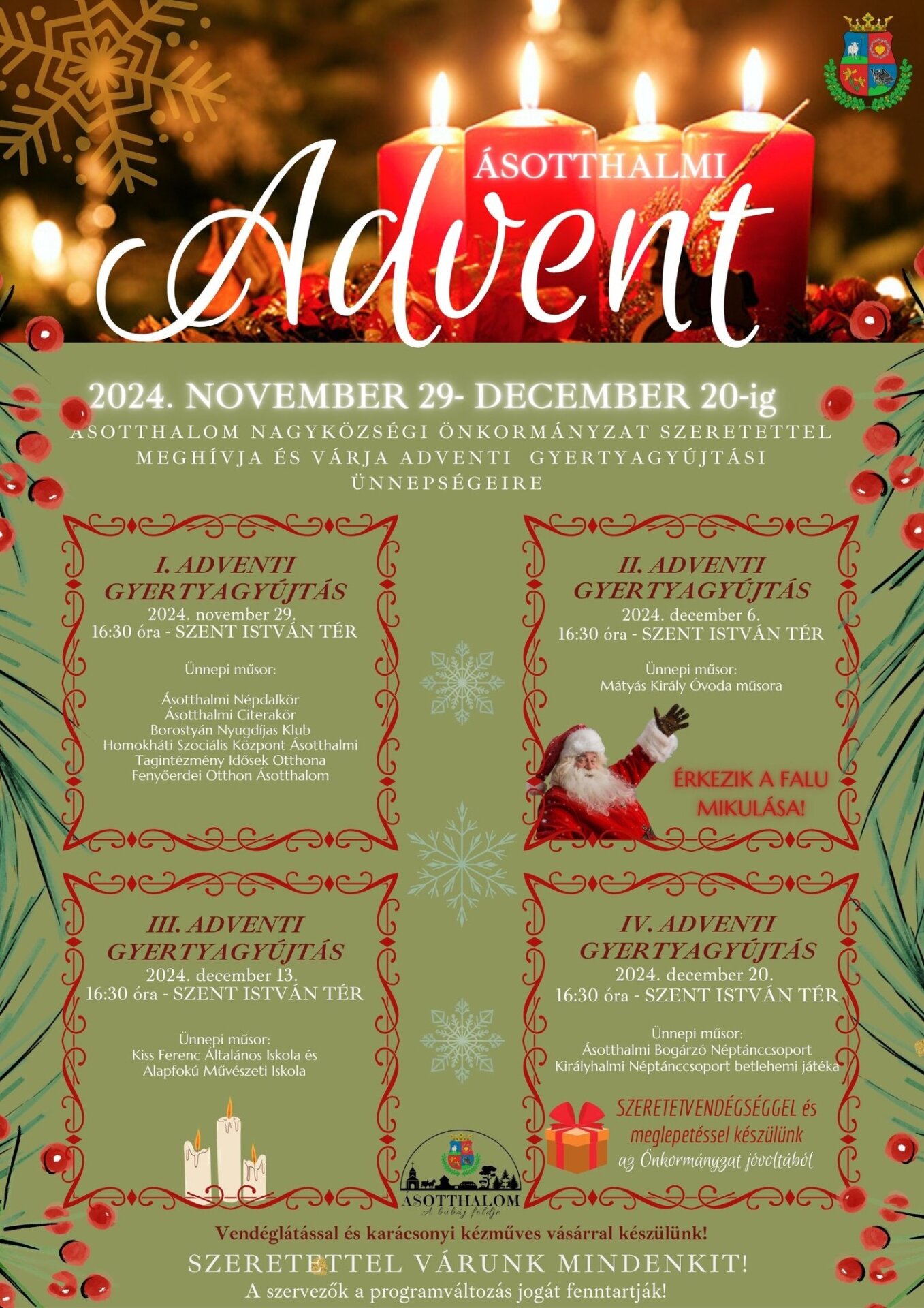 Ásotthalom Nagyközségi Önkormányzat Szeretettel meghívja és várja adventi gyertyagyújtási ünnepségeire