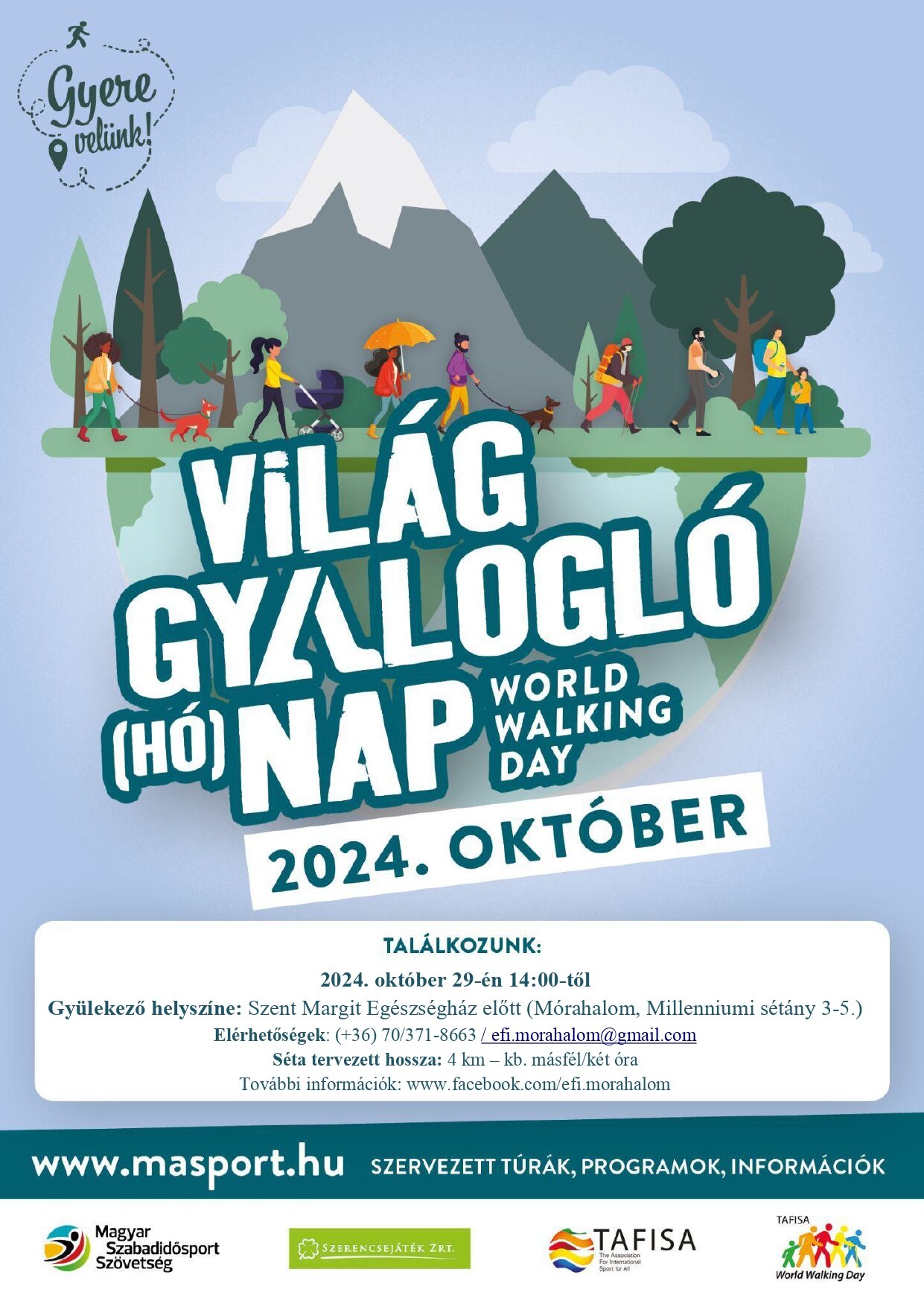 A Magyar Szabadidősport Szövetség idén is meghirdette a Világ Gyalogló(HÓ)Nap (World Walking Day) hazai rendezvénysorozatát, amely egész októberben Magyarország területén zajlik. A programsorozat célja a gyaloglás népszerűsítése, melyhez idén a Mórahalmi Egészségfejlesztési Iroda is csatlakozik!