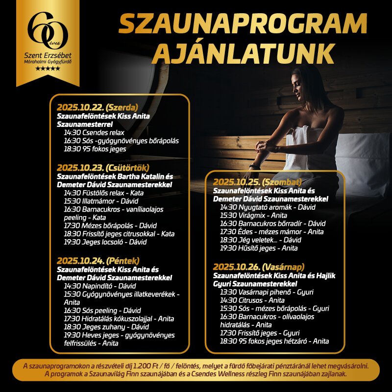 A rendszeres szauna programok keretében a vendégek kényeztetéséről és a professzionális szaunázásról képzett szaunamesterek gondoskodnak.
