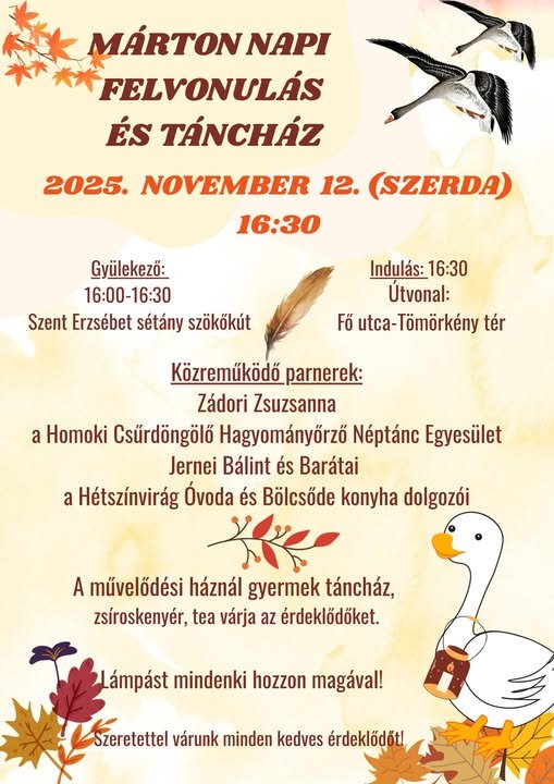 Szeretettel várunk minden kicsit és nagyot 2025. november 12-én (szerdán), hogy együtt ünnepeljük Márton napját egy fényes, táncos és vidám lámpás felvonulással!