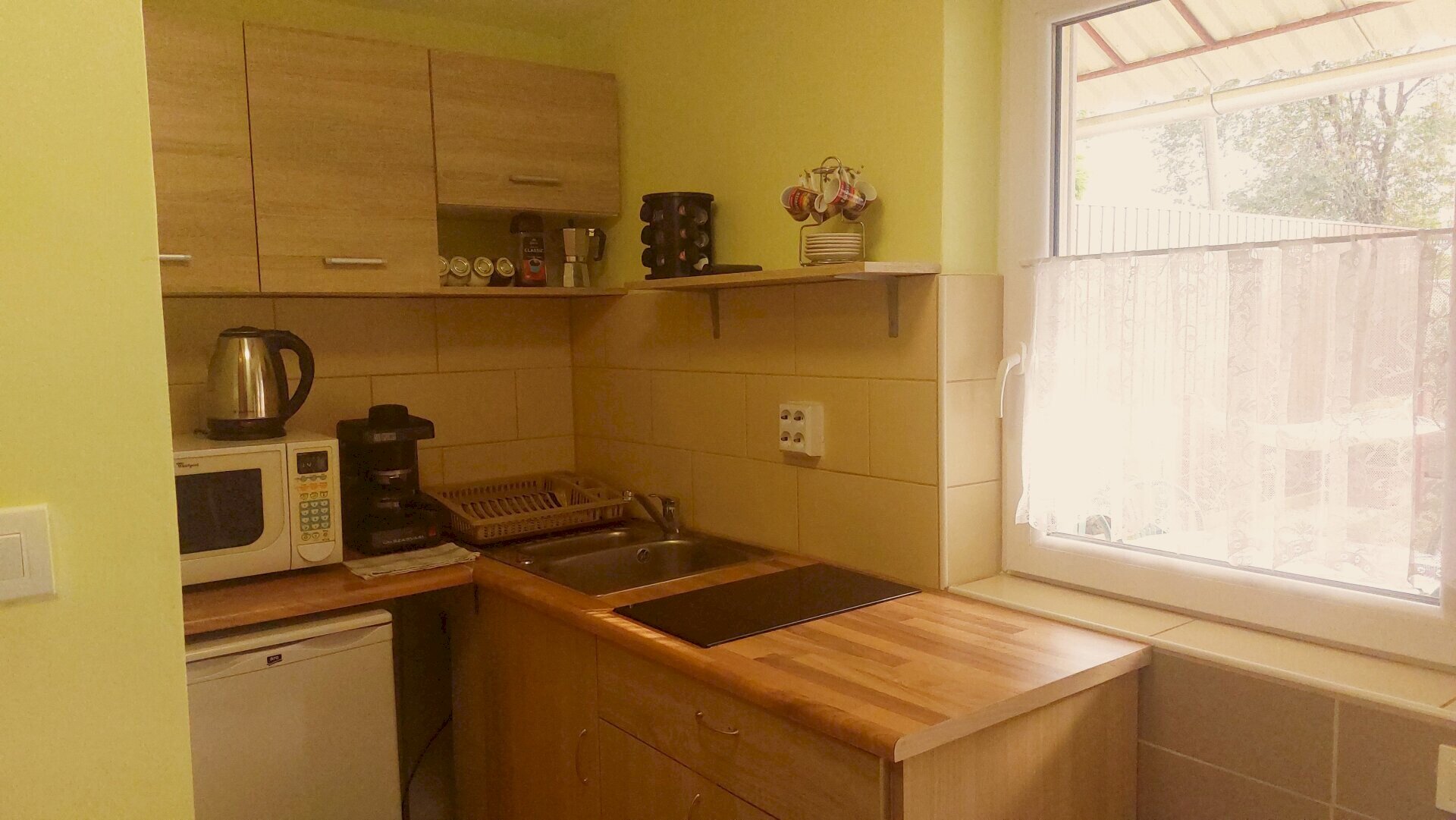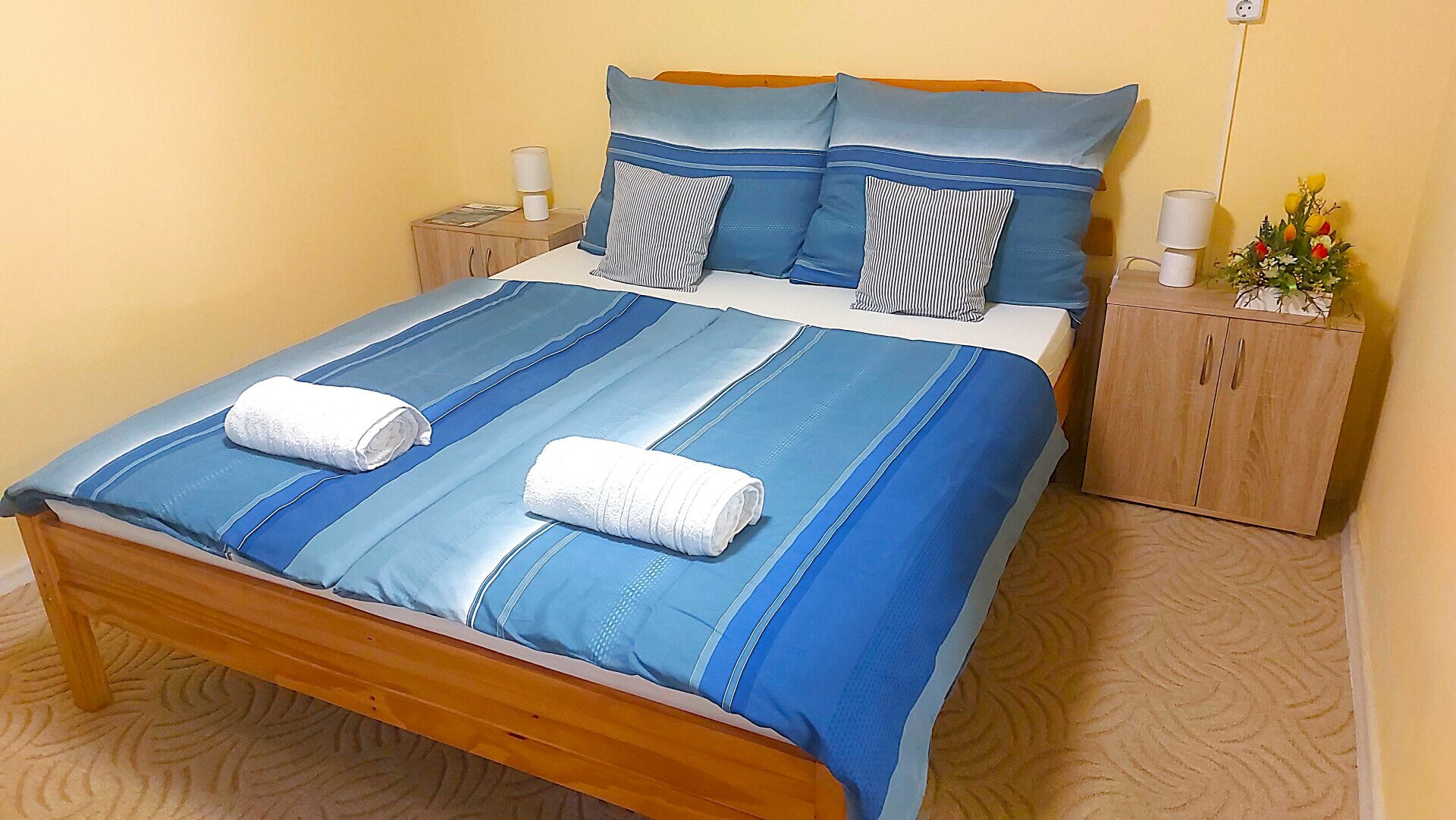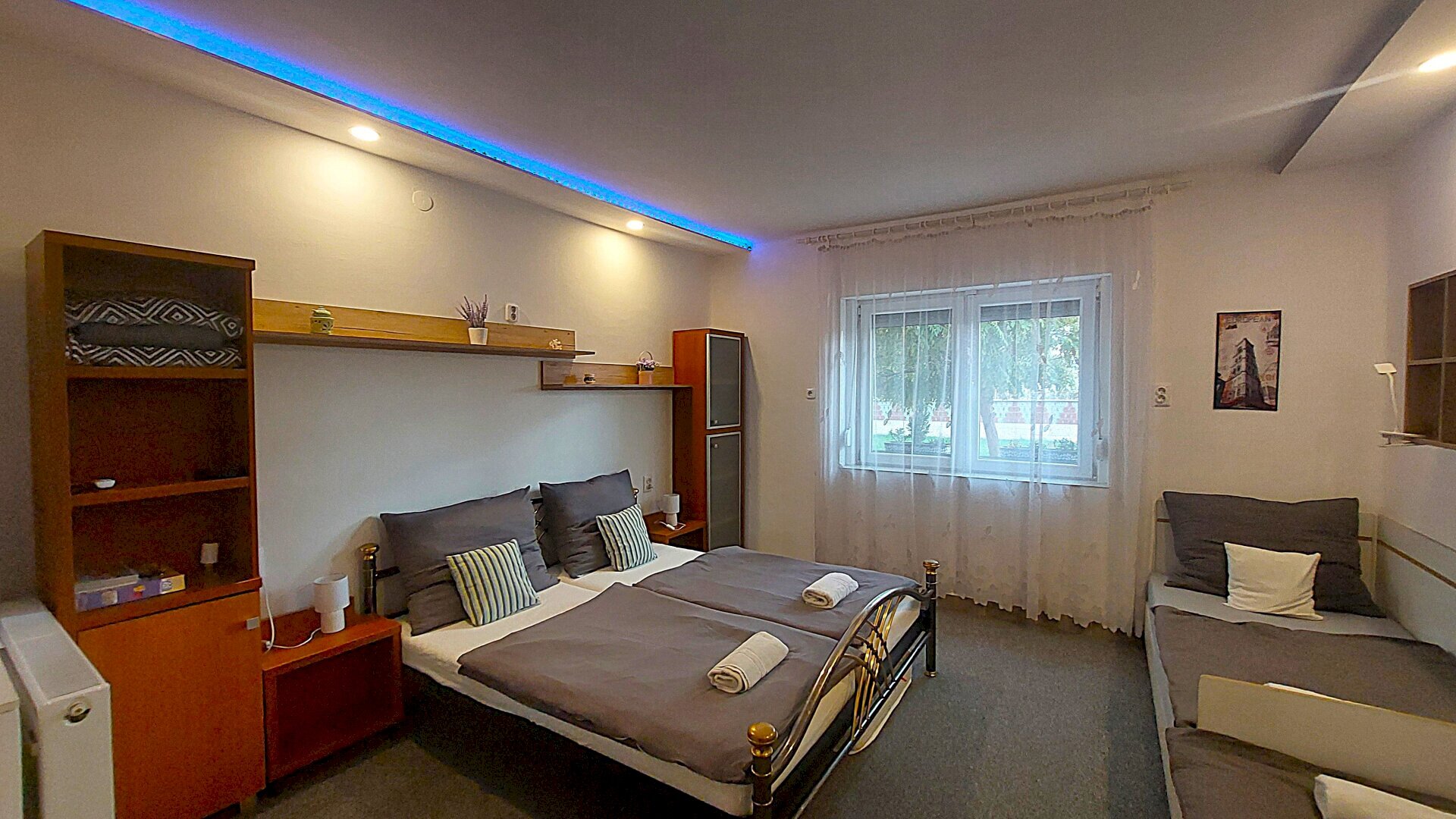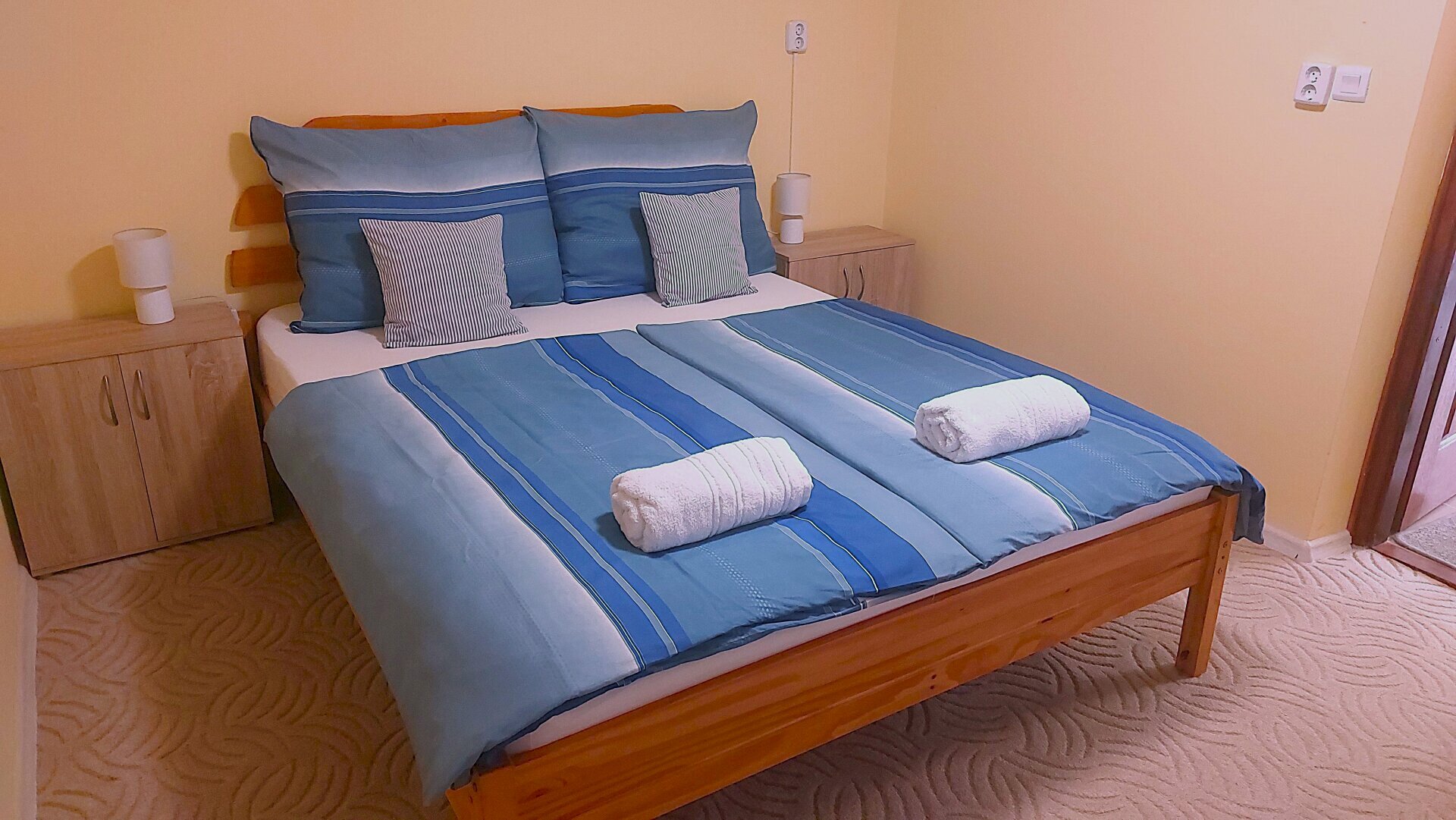 A földszintes apartmanban 6+2 fős két hálószoba, nappali, felszerelt konyha és két fürdőszoba található. A nagyobb hálószobában egy nagy franciaágy és két egyszemélyes ágy van, a második kisebb hálószobában két egyszemélyes ágy, a nappaliban egy kétszemélyes kihúzható kanapé található. A lakóegység az utcára nyílik, udvara nincs, de előtte parkolóhelyek vannak. A szobákban síkképernyős tv, Wifi van, a konyha teljesen felszerelt (kávéfőző, főzőlap, vízforraló, edények, kombinált hűtőszekrény fagyasztóval stb.). A közelben élelmiszerbolt (Coop abc), Rossmann, Pepco, pékség, fagyizó, pizzéria, étterem stb. található.
