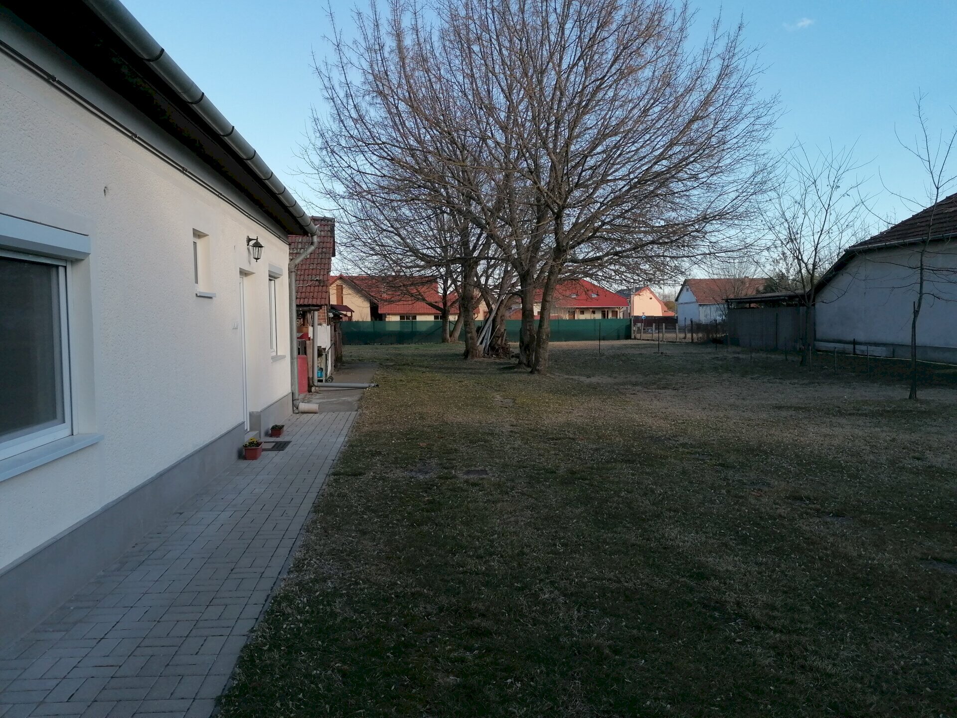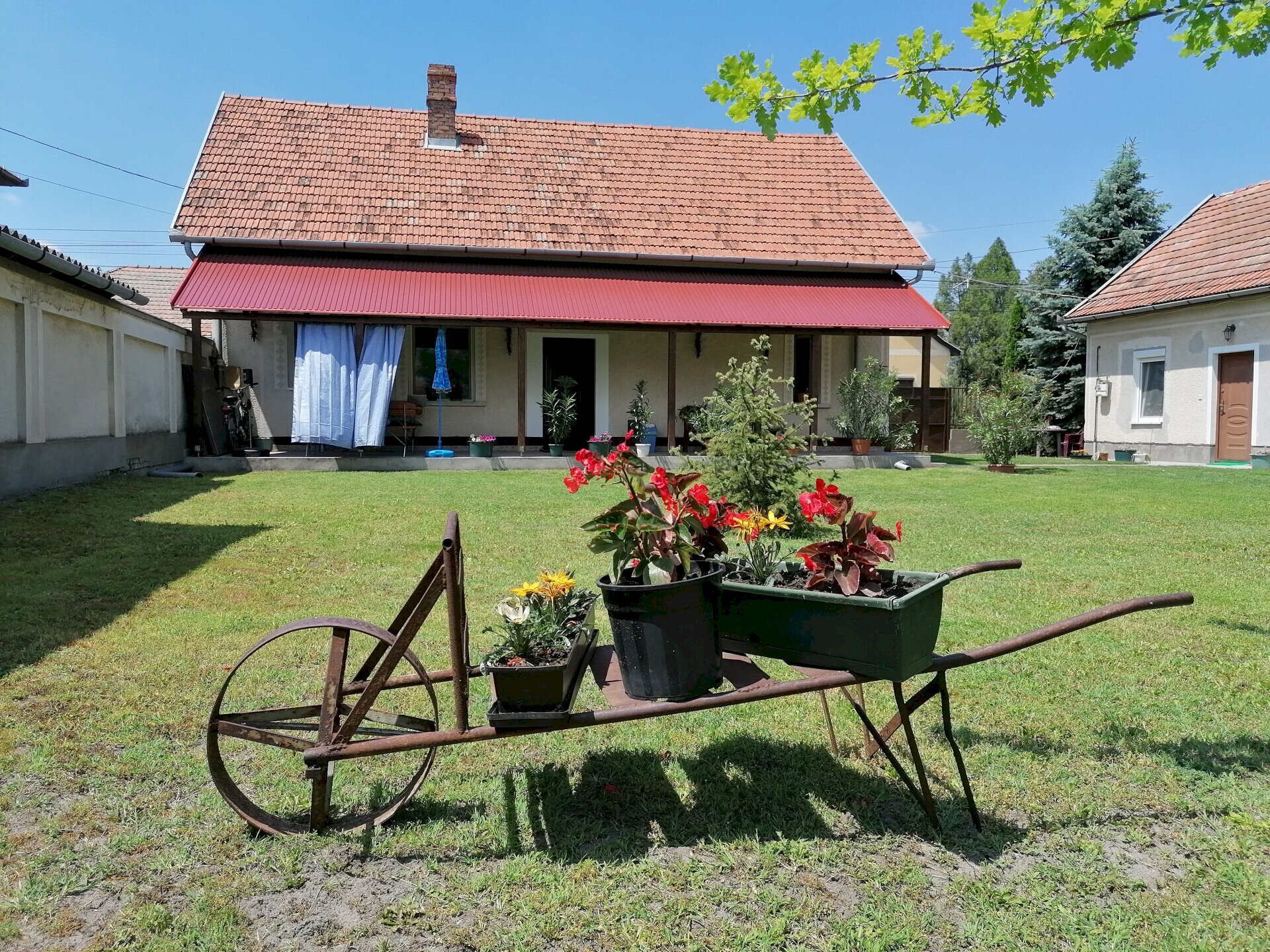 Saját parkosított udvarral, parkolási lehetőséggel és privát, nagy fedett terasszal rendelkezik, melyen kerti bútorok (fotel, asztal, székek) is megtalálhatóak.