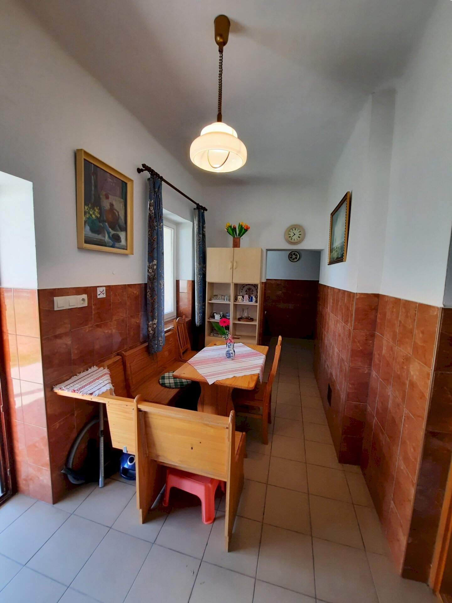 Az ajtón belépve balra az ebédlő, közvetlenül innen a konyha (gáztűzhely, vízforraló, mikró, nespresso és kotyogós kávéfőző, mély fagyasztós hűtőszekrény, kenyérpirító, konyhai eszközök) nyílik.
