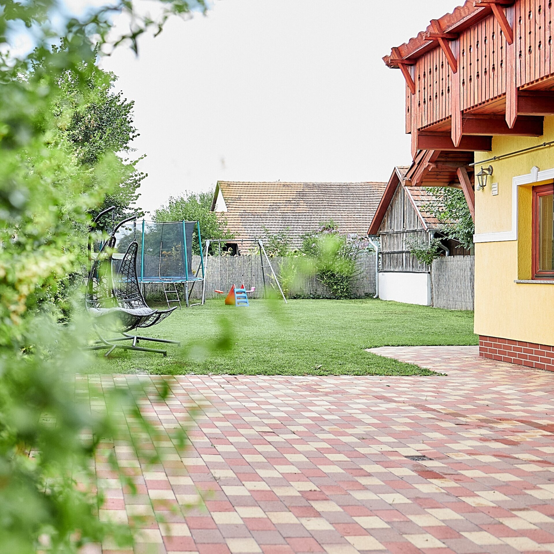 A füvesített kertben trambulin, hinta, csúszda, grillsütő, kerti asztalok és székek, napozó és hinta ágyak várják a vendégeket.