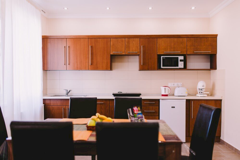 Egy franciaágyas szoba konyharésszel közös hálótérben, saját (zuhanyfülkés) fürdőszobával. Az apartman nem pótágyazható, a konyha jól felszerelt.
