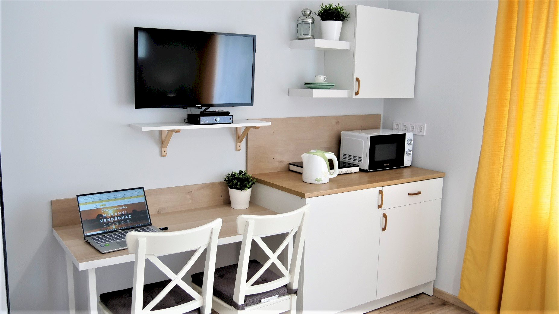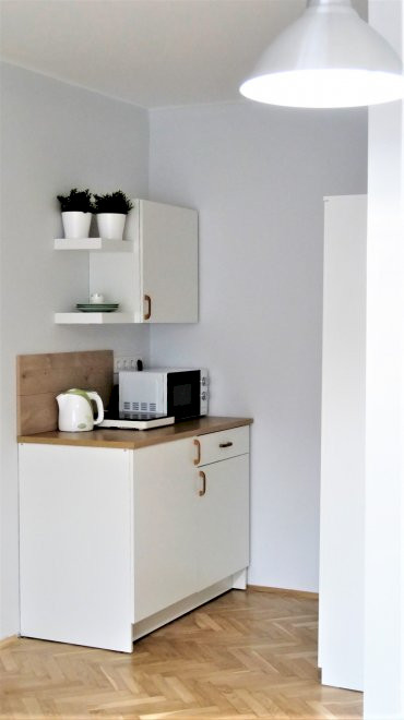 A teakonyha felszerelése: mikrohullámú sütő, hűtő, vízforraló, főzőlap.