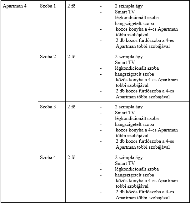 A fejlesztés eredményeként 4 külön bejáratú apartman jött létre, mely összesen 16 + 4 fő befogadására alkalmas. A pályázat 2023. novemberében zárul le, de már júliusban fogadott vendégeket az apartman.