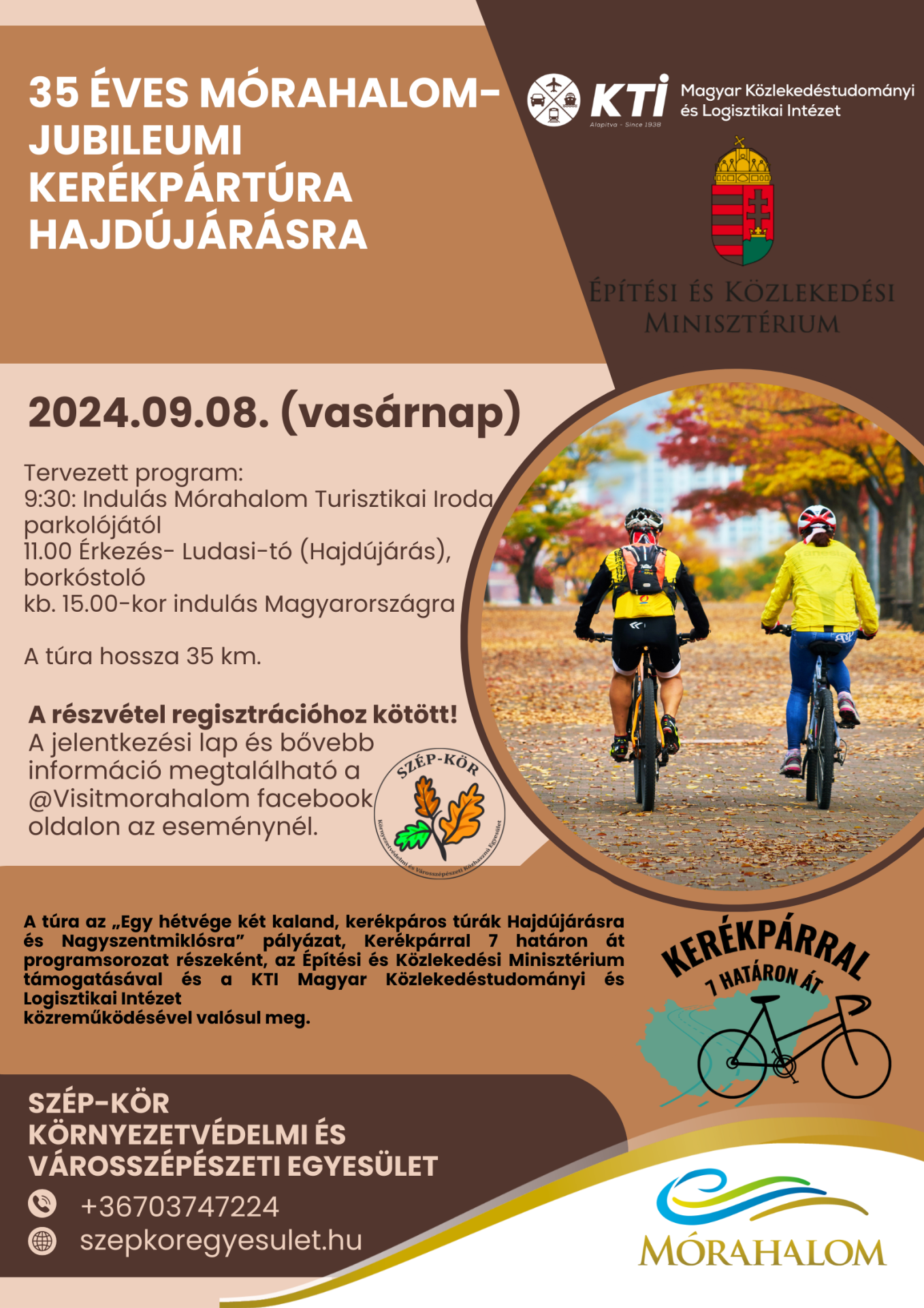 Szeptember 8.-án a mórahalmi SZÉP-KÖR Környezetvédelmi és Városszépészeti Egyesület kerékpáros túráján 35 km-es távot teljesíthetünk együtt. Az út során szakképzett túravezetővel vesszük az akadályt.
