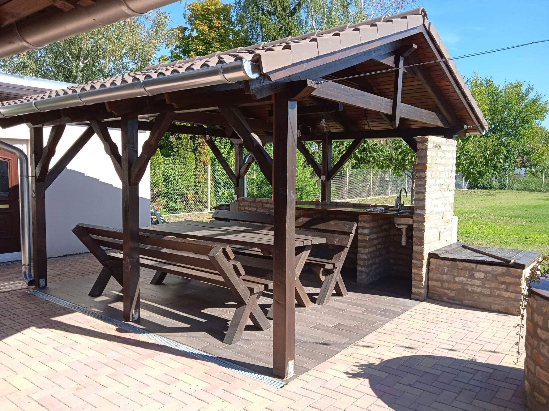 - Postavljen u dvorištu, sa natkrivenim roštiljem i spoljnom kuhinjskom pultom
