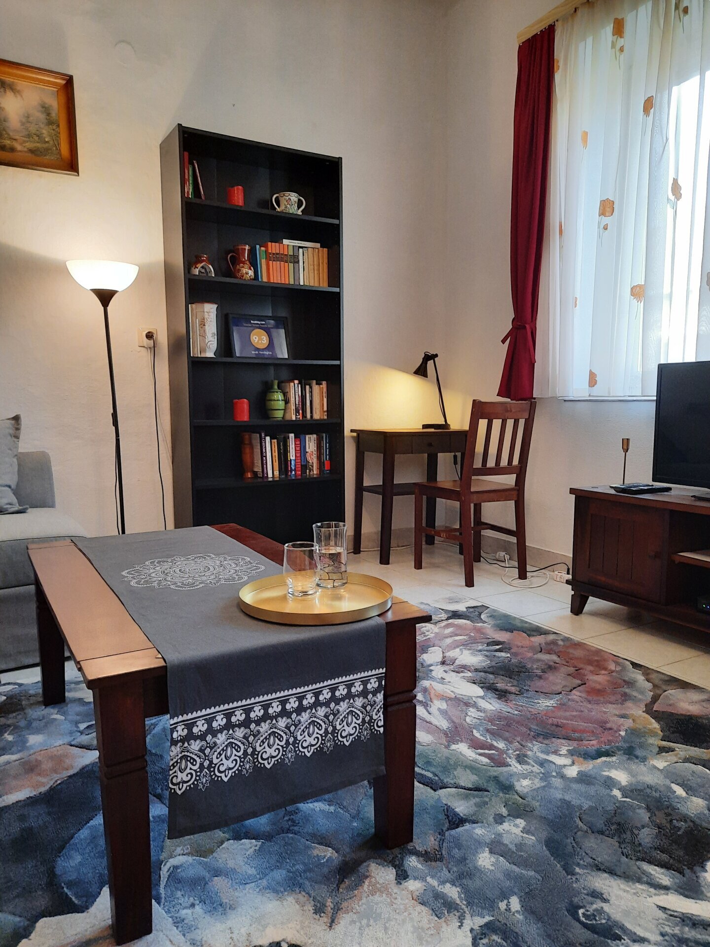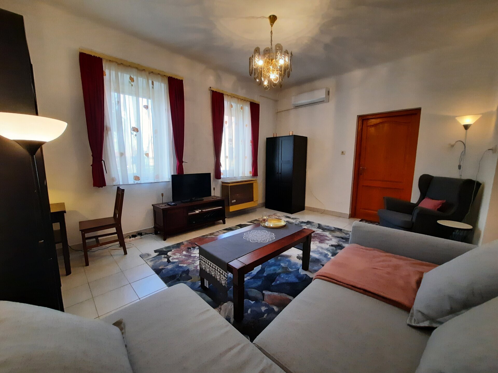 Pri ulasku na ulazna vrata je mali vestibul (vetrobran), odavde (takođe) levo je kupatilo (tuš, fen, toalet). Nasuprot je dnevna soba sa američkom kuhinjom. Kupatilu se takođe može pristupiti iz ove prostorije. Kuhinja je dobro opremljena i ima: nespresso aparat za kafu, kuvalo za vodu, toster, frižider, šporet na plin, posuđe, trpezarijski sto. Stan je klimatizovan.