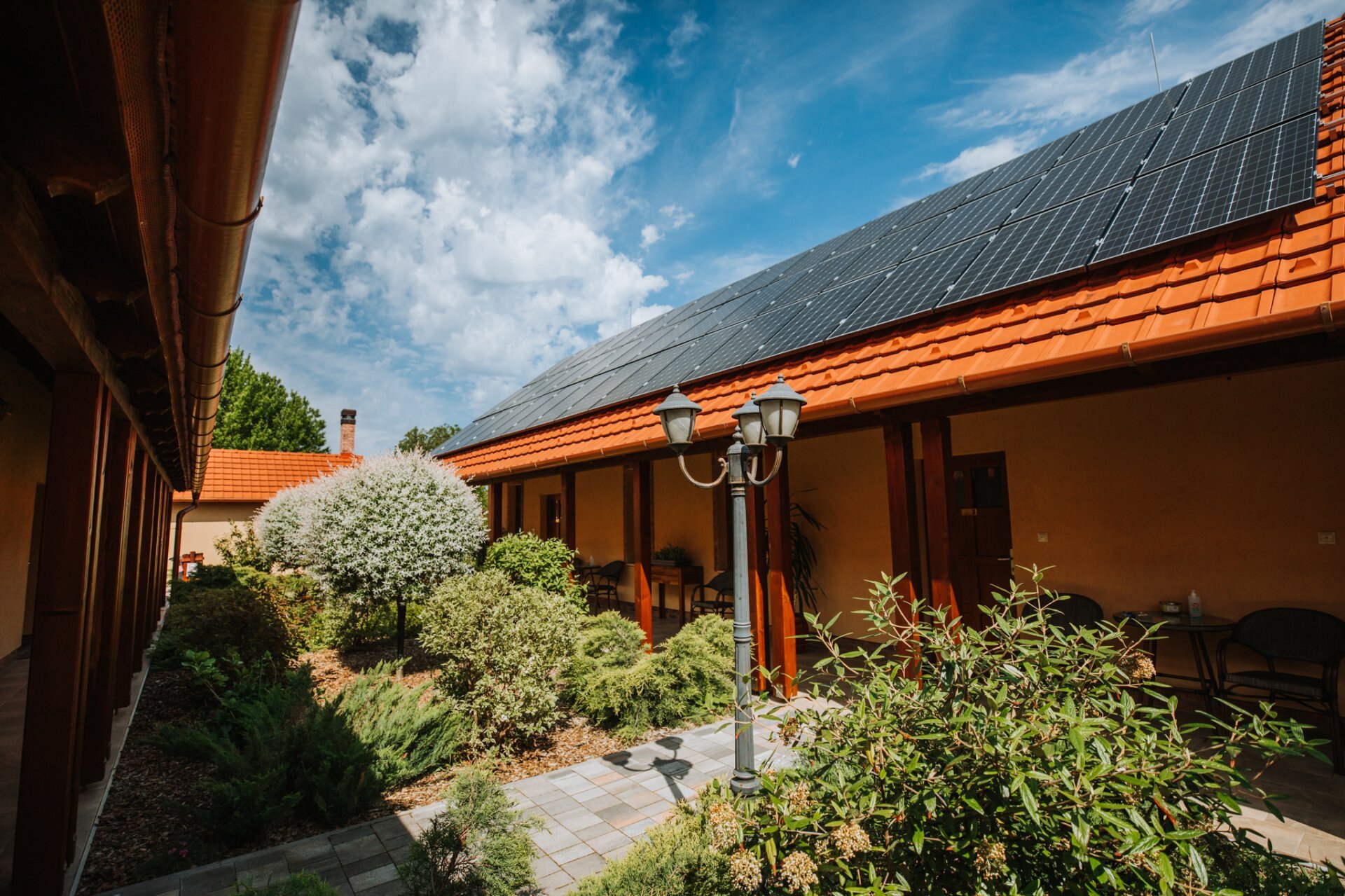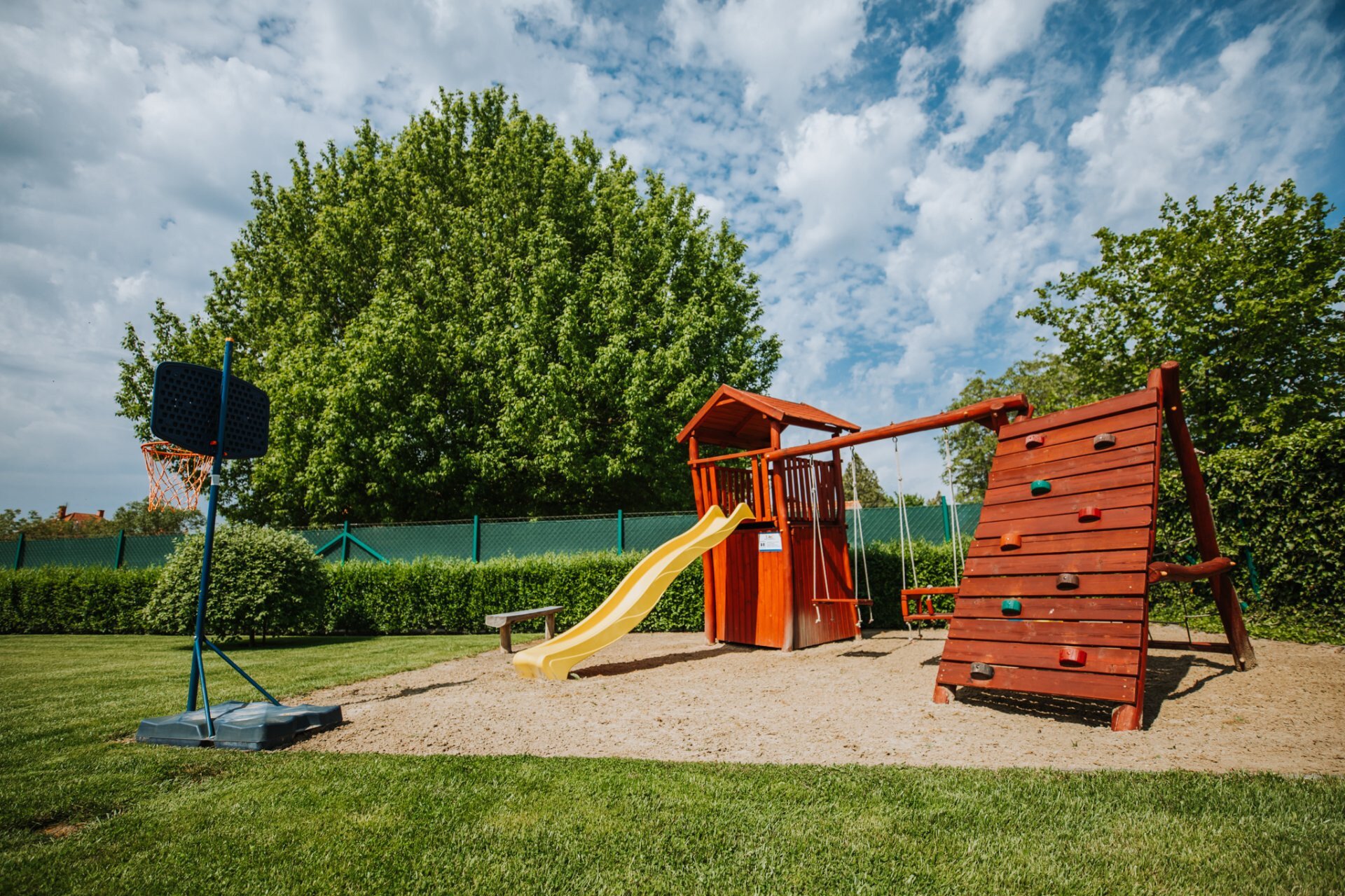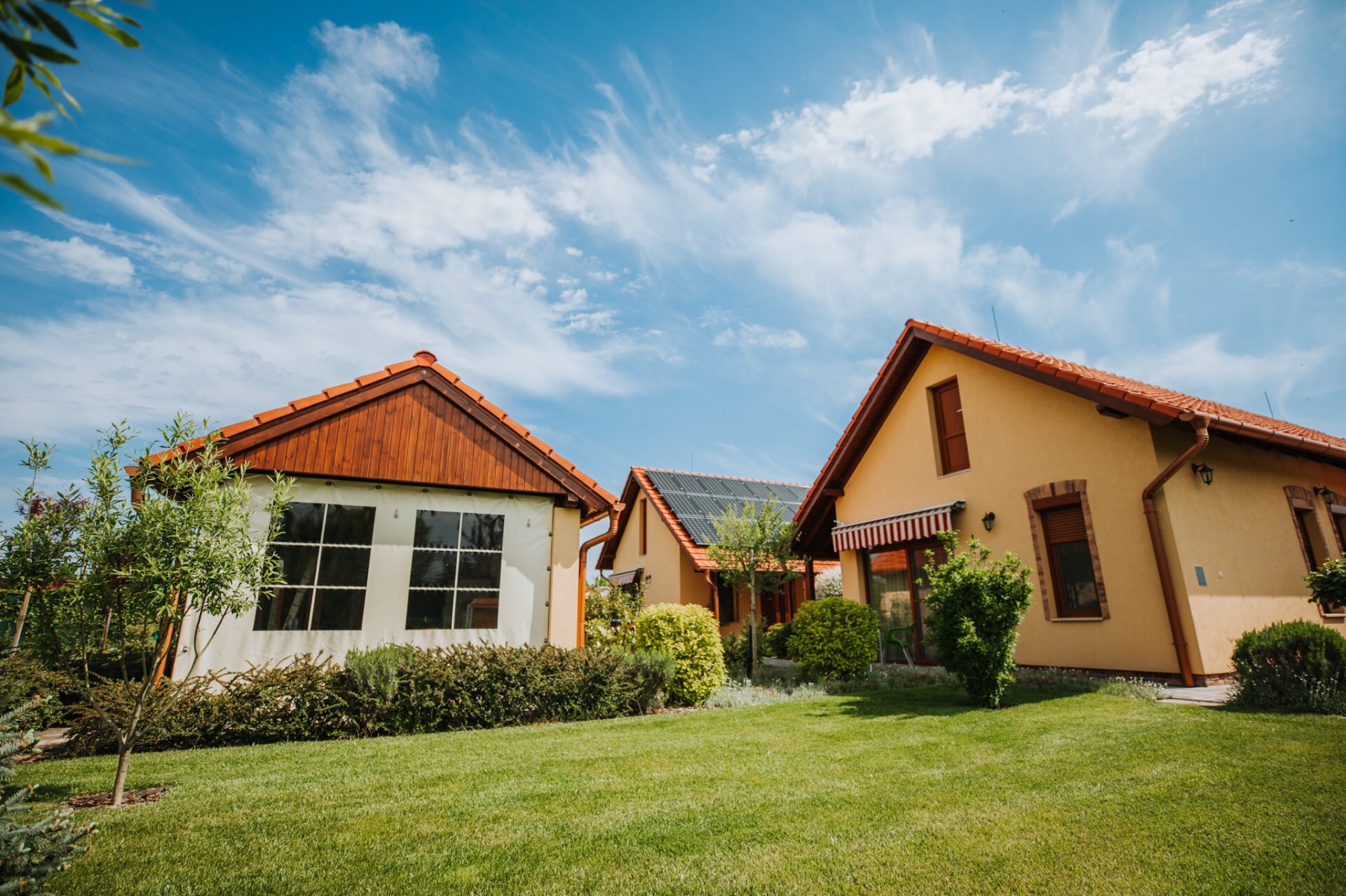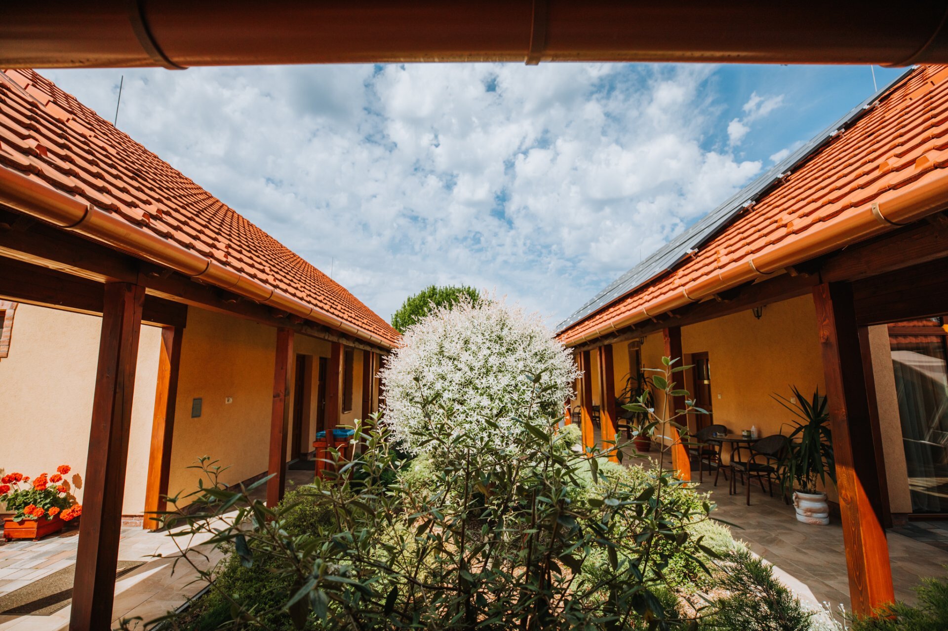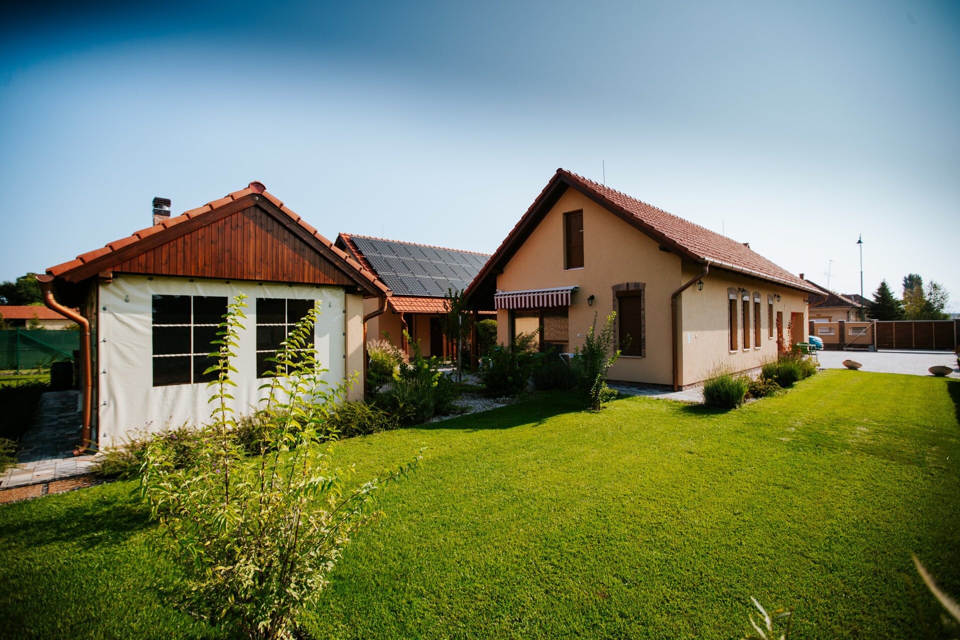 Svaki apartman ima natkrivenu terasu, zeleni deo za sedenje, uređeno dvorište i zatvoren parking. Baštenska zajednička prostorija sa roštiljem, kuvalo za vodu, pribor za kuvanje. Dečje igralište (tobogan, ljuljaške, gol za mali fudbal, koš za košarku, igralište u pesku).