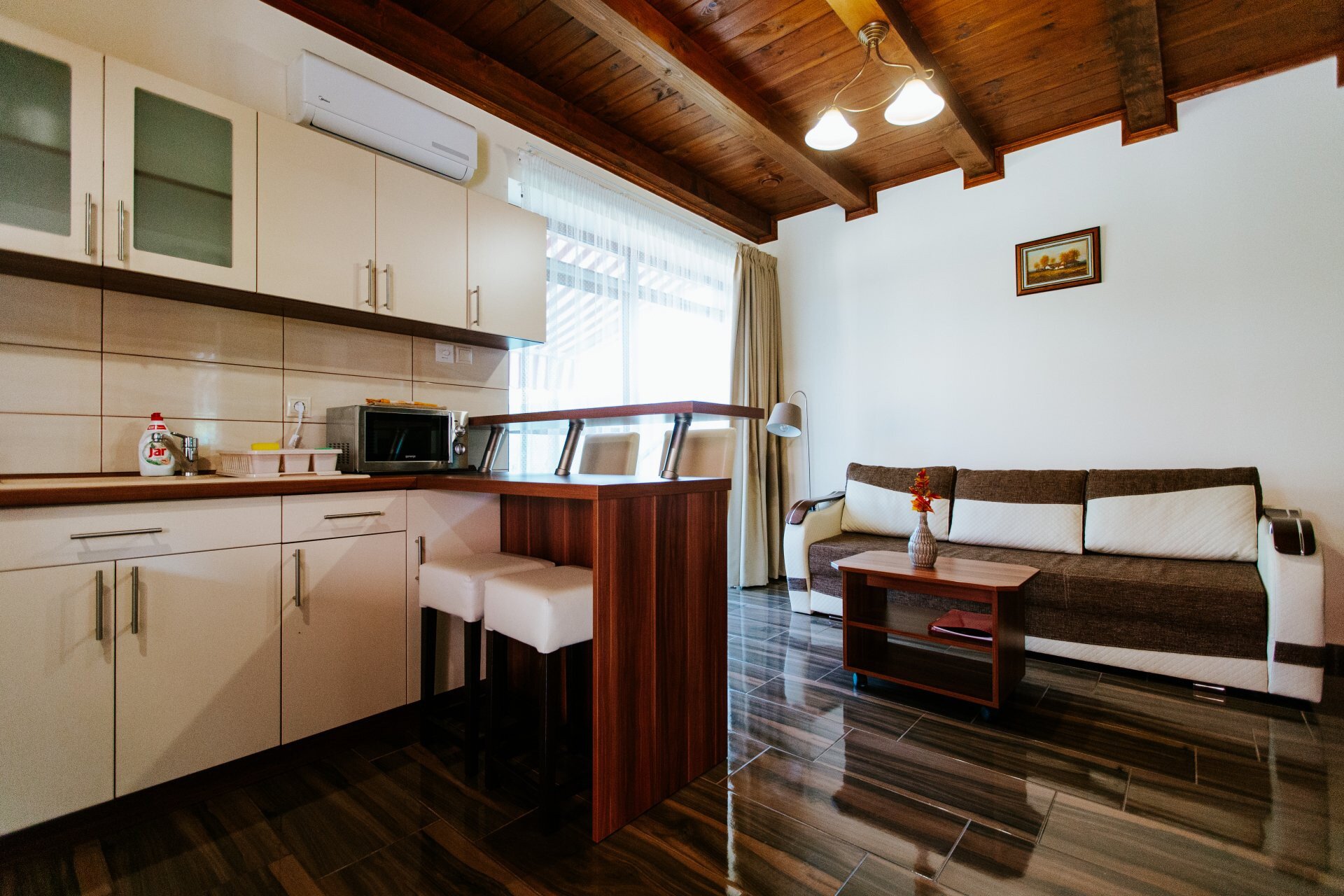 U jednom prostoru: kuhinja-trpezarija, spavaća soba i dnevni boravak sa 1 bračnim krevetom, 1 kaučem na razvlačenje za 2 osobe i pristupačnim mokrim čvorom.